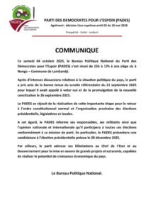 Le Parti des Démocrates pour l’Espoir (PADES) a annoncé, à l’issue de la réunion de son Bureau politique national tenue ce samedi 4 octobre à Conakry, qu’il présentera un candidat à la prochaine élection présidentielle. Le parti du Dr Ousmane Kaba participera également à l’ensemble des scrutins à venir. Satisfait du bon déroulement du référendum du 21 septembre et de la promulgation de la nouvelle Constitution, le PADES salue ces avancées vers un retour à l’ordre constitutionnel et félicite le gouvernement pour les projets de développement engagés.