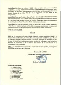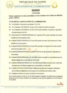 La Haute Autorité de la Communication (HAC) a prononcé, ce jeudi 23 avril 2026, la suspension de l’émission Guinée Today diffusée sur la chaîne Télé 24. Dans la même décision, les journalistes Aboubacar Diallo et Sékou Bah ont également été suspendus pour une durée de trois mois, pour des faits liés à la propagande électorale.