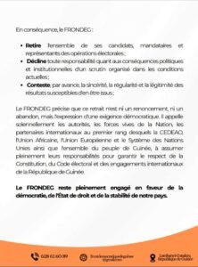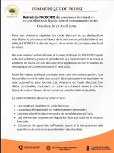 Dans une déclaration rendue publique ce lundi 28 avril 2026, le FRONDEG, dirigé par Yero Baldé, a annoncé son retrait des élections législatives et communales prévues dans les prochaines semaines.