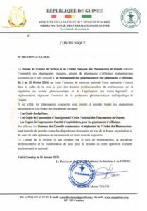 Dans un communiqué en date du 30 janvier 2026, le Conseil de Section A de l’ordre des pharmaciens de Guinee informe qu’une opération de recensement des Pharmaciens et d’officines se déroulera du 02 au 20 fevrier 2026.