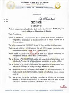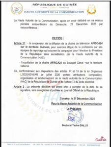 Dans la soirée de ce dimanche, la Haute Autorité de la Communication (HAC) a procédé à la suspension et au retrait de la chaîne Africa24 du bouquet Canal du territoire guinéen pour exercice illégal.
